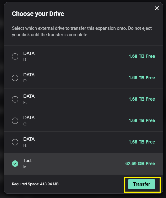 8. Once the transfer is complete, you will receive a Transfer Complete message confirming the drive the expansion has been transferred to