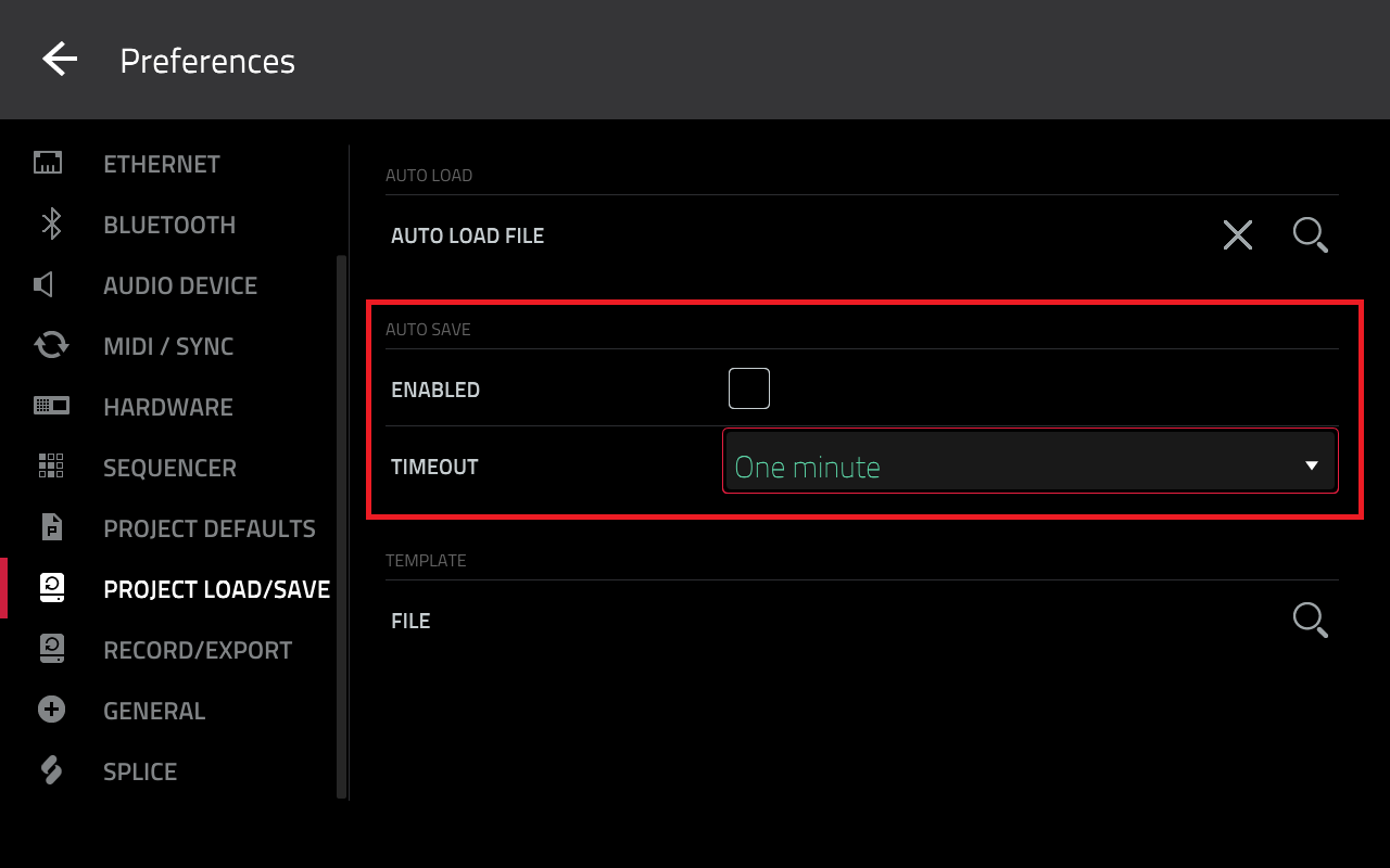 When auto save is enabled, your MPC will automatically save your project within a set time frame (1 min, 2 mins, 5 min and 10 mins):