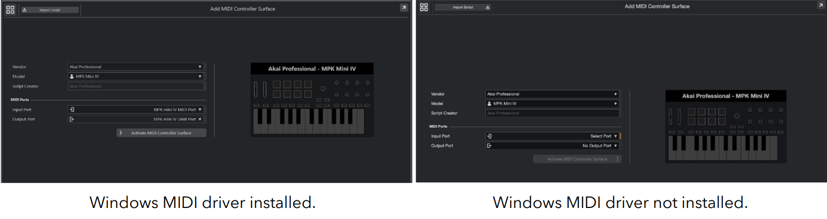 Note: The ports appear as listed above when the Windows MIDI Driver is installed. If the Windows MIDI Driver is not installed, the Input Port appears as “MIDIIN2” and the Output Port appears as “MIDIOUT2” instead. Make sure the driver has been installed for best results. You may need to delete the previous Controller Surface after installing the Windows driver