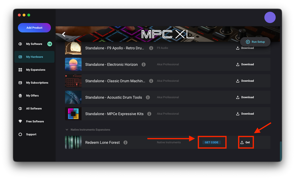 - In the inMusic Software Center, go to the 'My Hardware' tab and select your MPC XL (or check the 'My Expansions' tab), to find your Lone Forest Expansion offer.