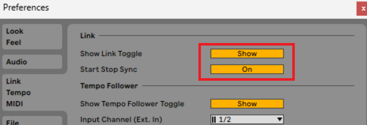 2. Ableton Live で、Preferences > Link Tempo MIDI を開き、 Show Link Toggle と Start Stop Sync が選択されていることを確認してください。