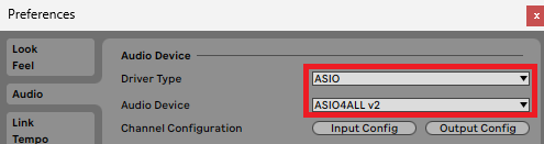 Windows の場合の注意:Link は ASIO4ALL driver がないと動作しません。ダウンロードしてインストールしたら、ドライバの種類とオーディオデバイスとして ASIO4ALL driver を使用してください。