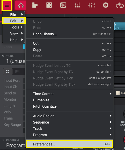1. MPC Beatsを起動し、Menu (≡) > Edit > Preferencesに進みます。