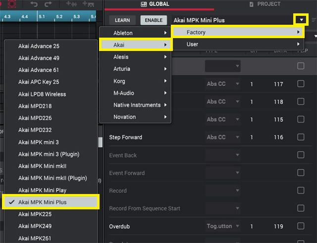2. MPK Mini Plus のマッピングファイルをロードします。 (Factory > Akai)