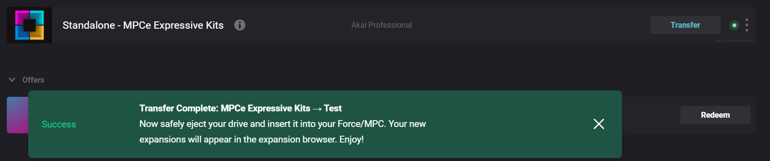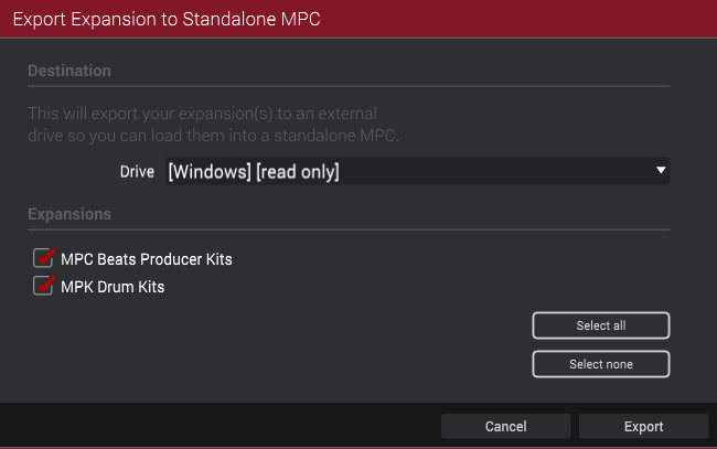 以下の情報は、MPCe Expressive Kits ExpansionをコンピューターからMPC XLおよびMPC Live IIIにコピーしてスタンドアロンで使用する手順を示しています。他の付属エクスパンションについても同様の手順が適用されます。