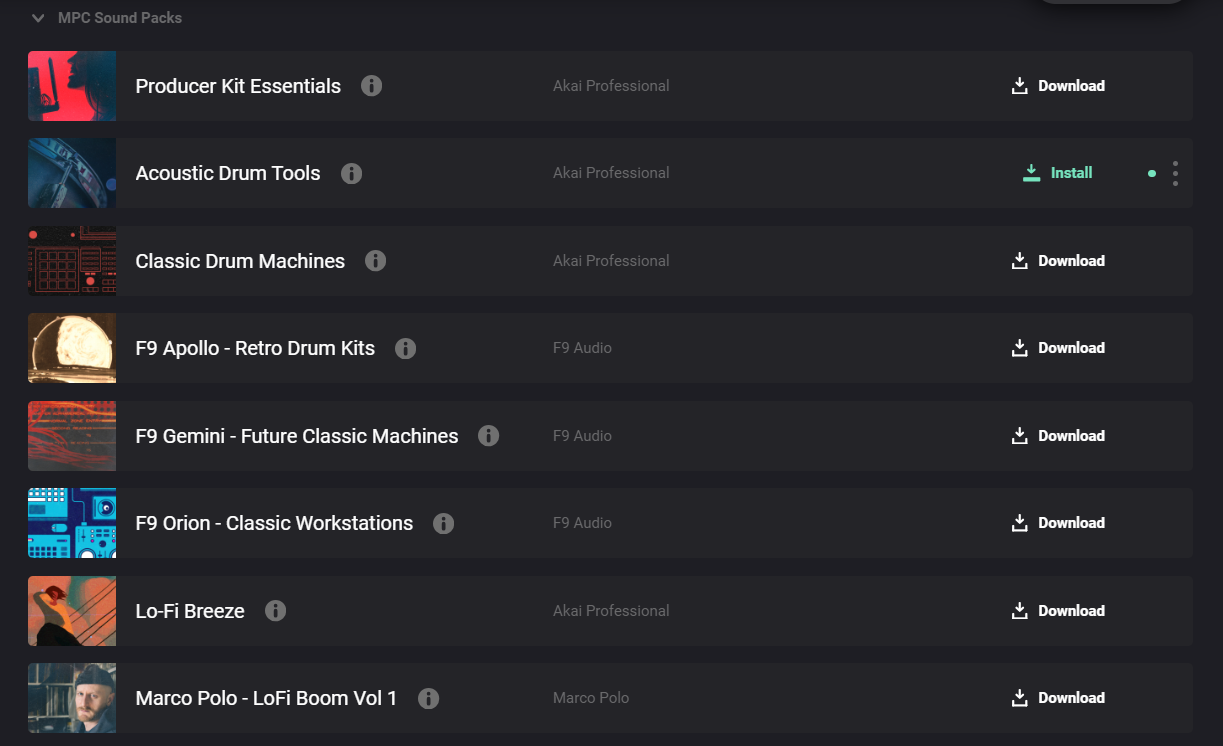 2. 「MPC Sound Packs」カテゴリに、MPC XLおよびMPC Live IIIに付属するすべてのコンテンツが表示されます。