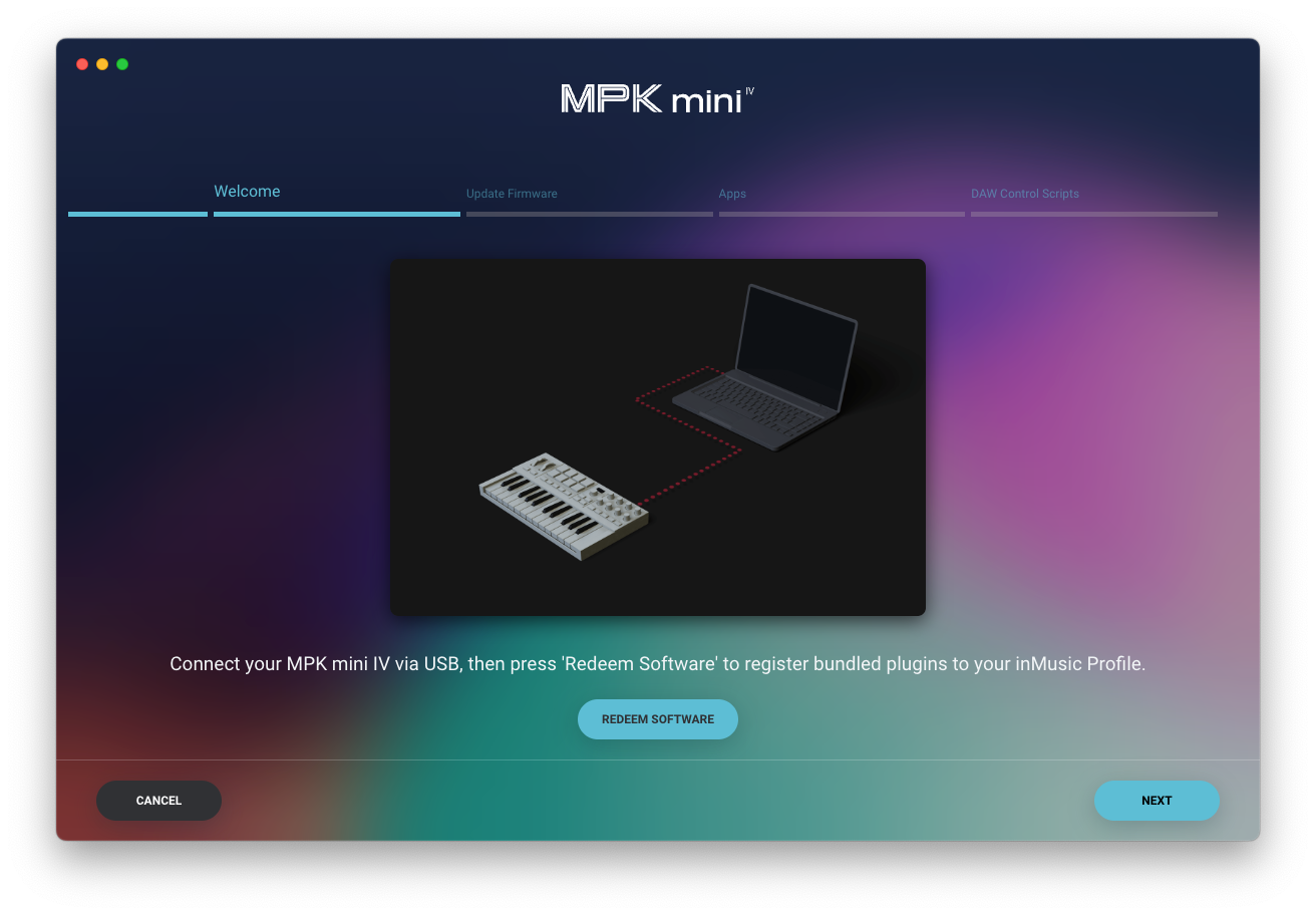 11. MPK mini IV を接続した状態で、画面の手順に従います。これにより、同梱ソフトウェアのライセンス引き換え(Redeem) が行われます。