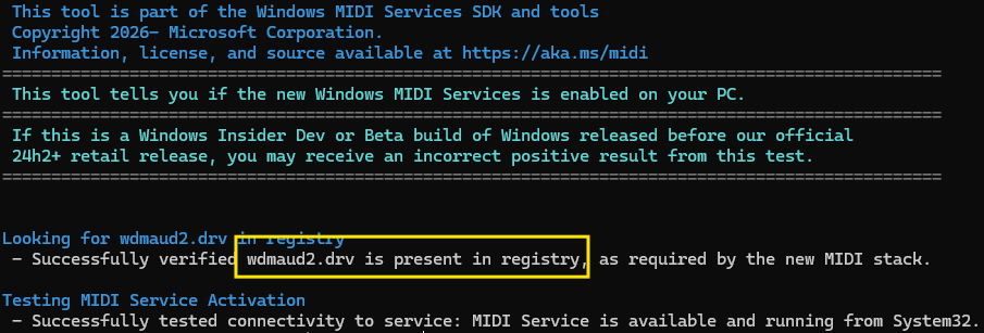 Microsoft は、更新された MIDI サービスがインストールされ有効になっているかを確認するため、システムをチェックできるツールを提供しています。確認するには以下の手順に従ってください: