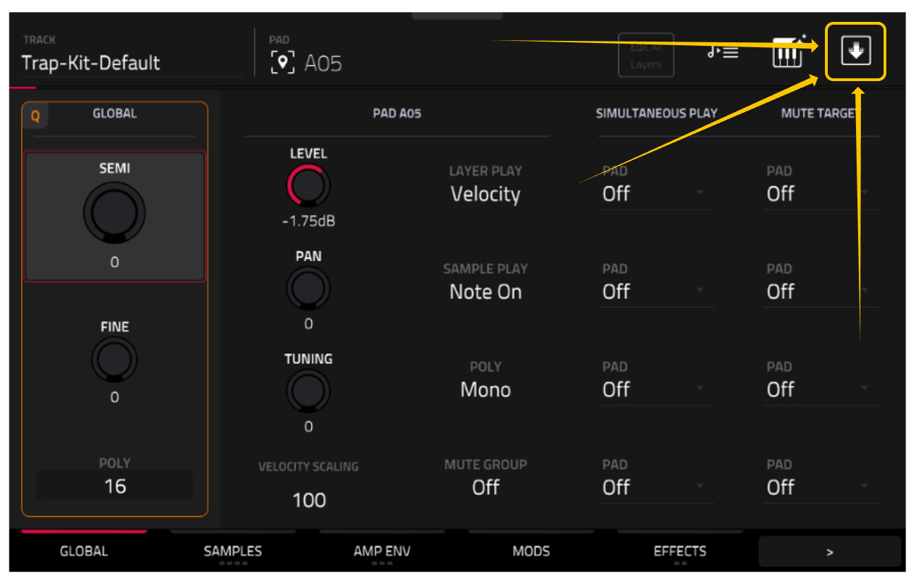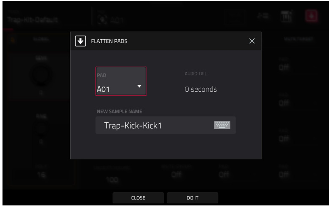 この問題を解決するには、「Flatten Pad」機能を使用できます。この機能は、パッドと適用されたエフェクトの両方を含む新しいオーディオファイルを作成し、エフェクトをサンプル自体に焼き付けます。これにより、4つのFXインサート・スロットすべてが再び使用可能になります。